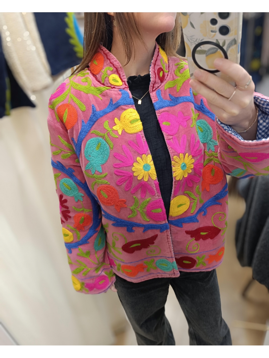° Velours coloris rose framboise avec broderies multicolores
