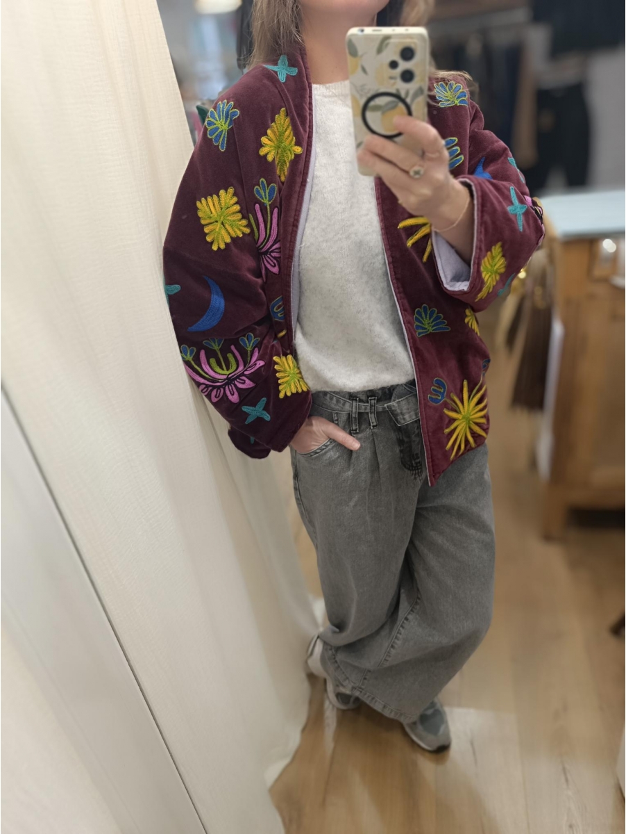 ° Velours coloris bordeaux prune avec broderies multicolores