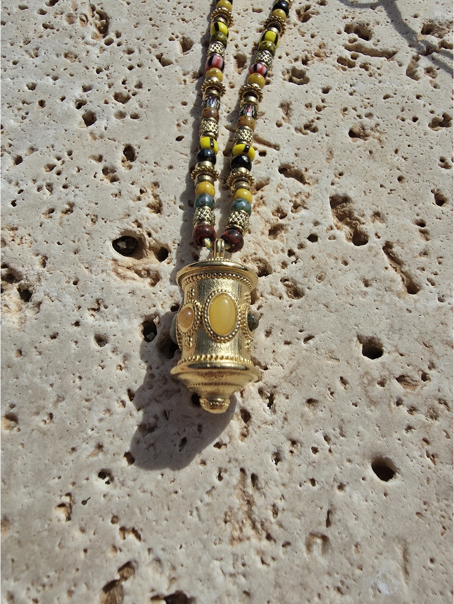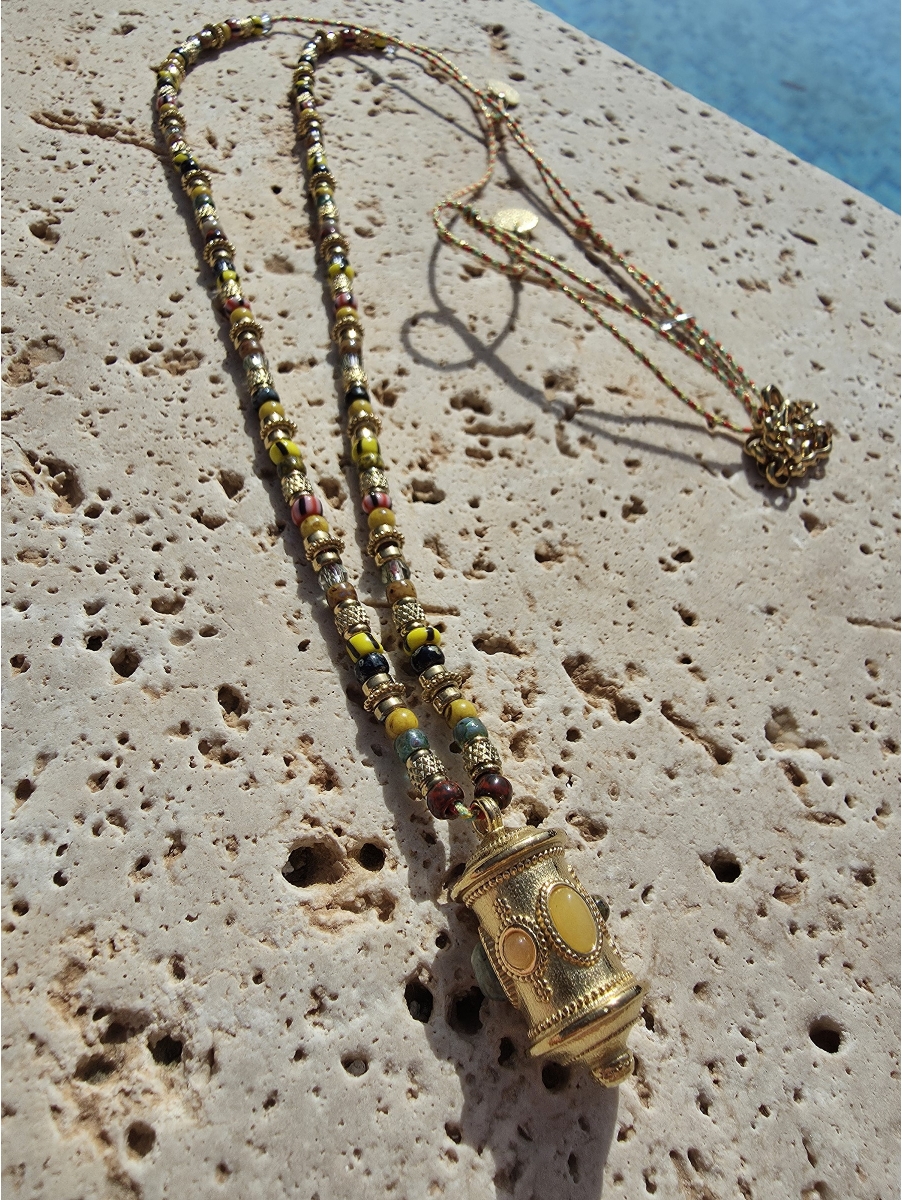 ° Liens ( rouge, vert et doré) supplémentaires pour le réglage des longueurs (peut se porter en sautoir ou en version collier plus court)